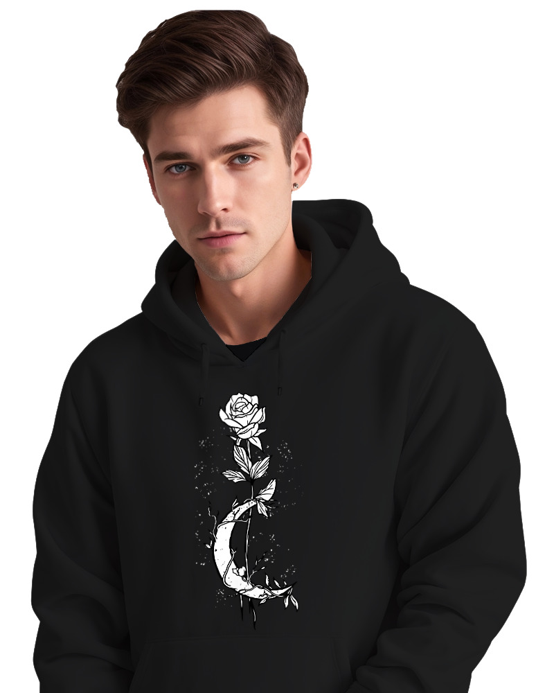 Αυτό το printed Φούτερ με κουκούλα δεν είναι απλώς ένα σχέδιο. Είναι η ένωση δύο κόσμων: το ρομαντικό τριαντάφυλλο και το μυστήριο της μισής σελήνης. 💥 Μαύρο και λευκό σε έντονη αντίθεση, για ένα αποτέλεσμα που βγάζει ένταση, μυστήριο και λίγο… μαγεία. Ιδανικό για lovers της urban μόδας, που θέλουν κάτι minimal αλλά statement.